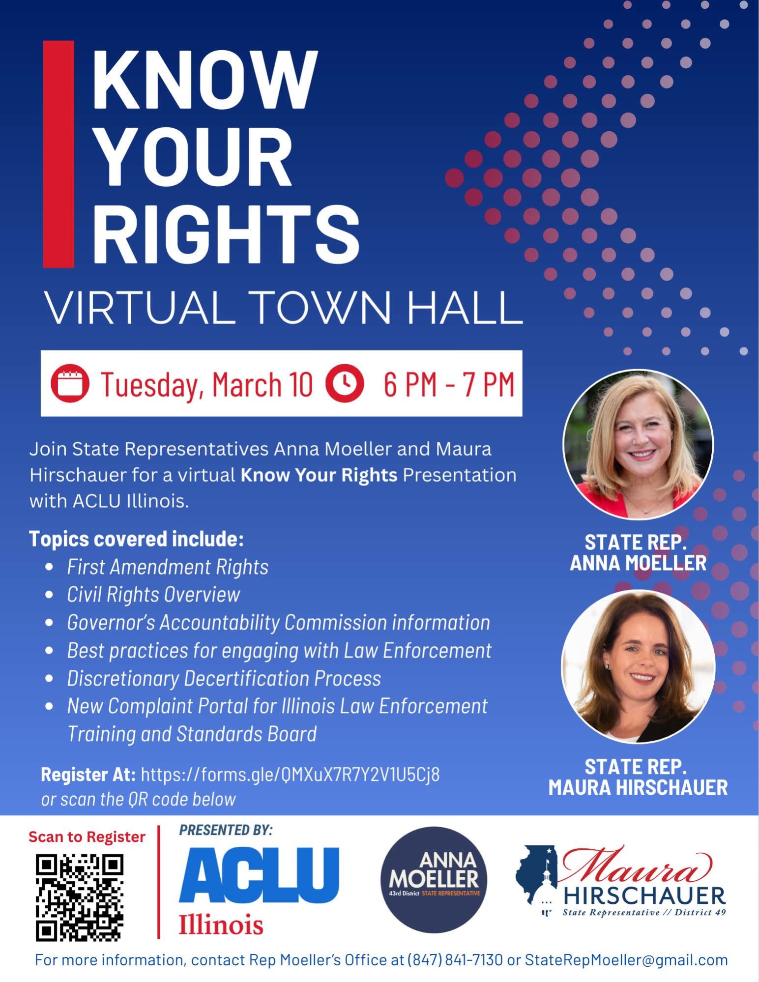 Join State Representatives Anna Moeller and Maura Hirschauer for a virtual Know Your Rights presentation with ACLU Illinois.