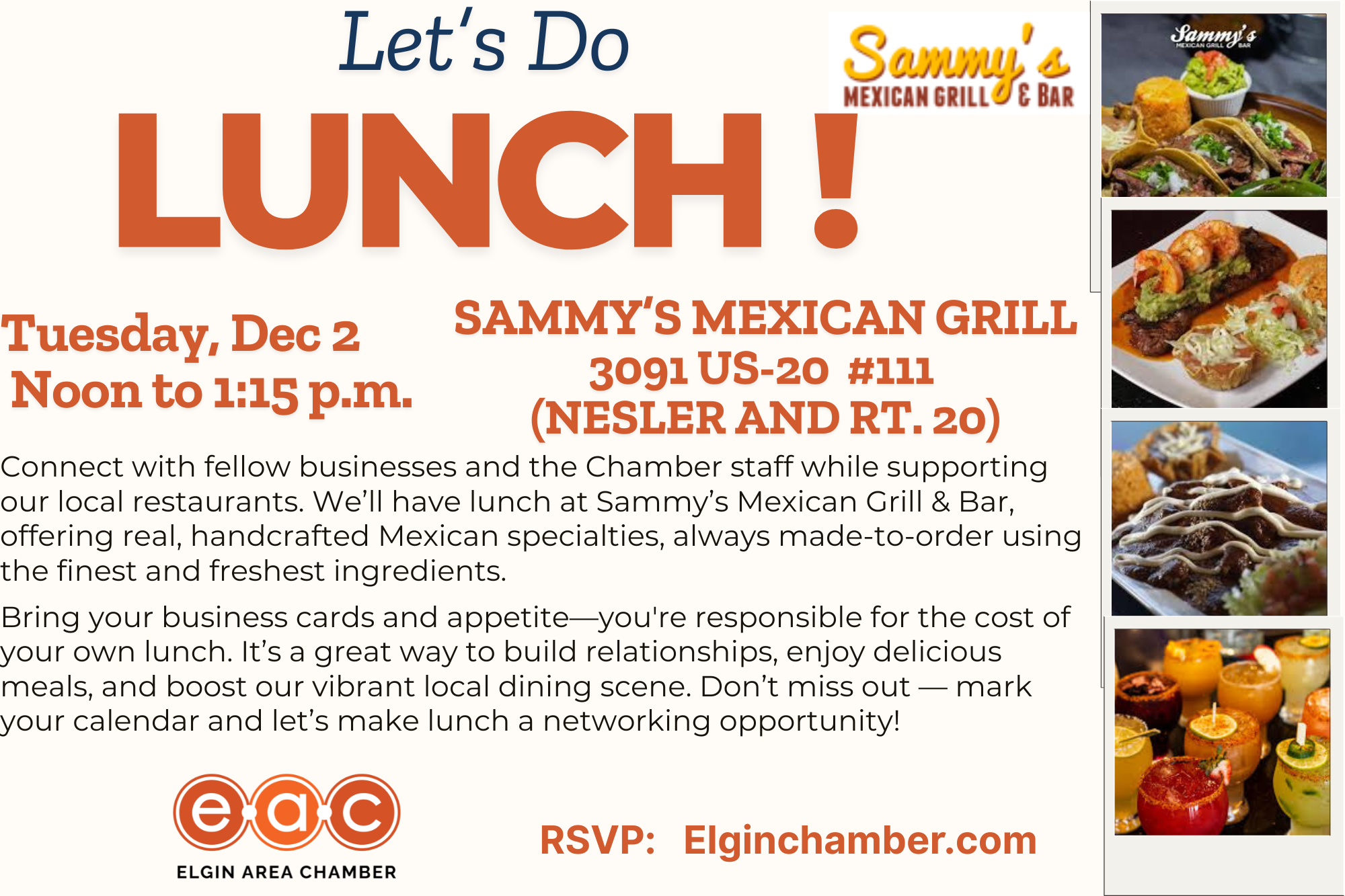 Connect with fellow businesses and the Chamber staff while supporting our local restaurants. We’ll have lunch at Sammy's Mexican Grill and Bar, offering handcrafted Mexican specialities, always made-to-order using the finest and freshest ingredients.