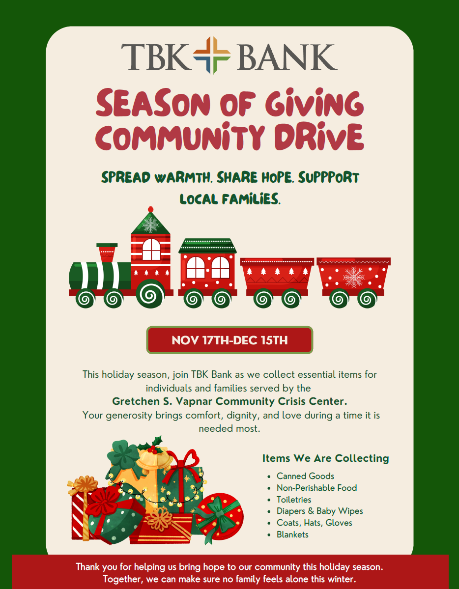 This holiday season, let's come together! TBK Bank is collaborating with the Gretchen S. Vapnar Community Crisis Center to collect essential items for our neighbors and families. Every act of kindness—your generosity—will bring warmth, dignity, and heartfelt love during a time when they need it most.