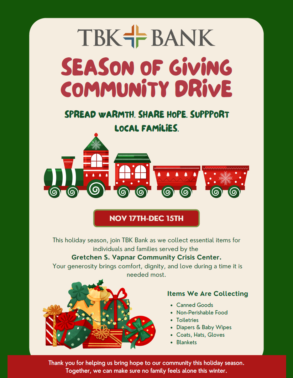 This holiday season, let's join hands! TBK Bank is partnering with the Gretchen S. Vapnar Community Crisis Center to gather essential items for our neighbors and families. Every act of kindness—your generosity—will deliver warmth, dignity, and heartfelt love during this time when they need it most.